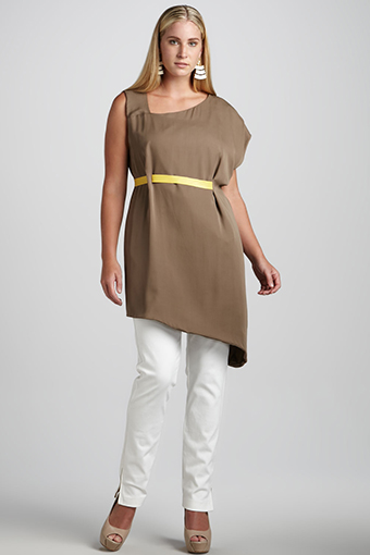 - Выбирайте ткани гладкой фактуры, которые хорошо драпируются и свободно ниспадают (а не обтягивают). Очень плотные и жесткие ткани добавляют объема. Лучше всего подойдут шерстяной креп, джерси, мягкие хлопковые и льняные ткани, шелк.