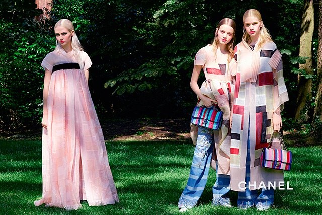 На фоне сочной зелени городского парка азиатские мотивы и мозаичные принты выглядят очень гармонично, свежо и невероятно красиво. Для креативного дизайнера и по совместительству фотографа Карлу Лагерфельду позировали в новой круизной кампании Шарлотт Фри, Стелла Лучия и Китти Хайес. Они, точно лесные нимфы, кружат среди деревьев в карамельно-розовых джемперах, пышных юбках в стиле пэчворк и джинсах-клеш.