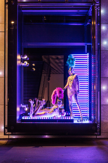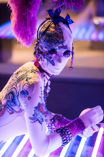 Другие манекены располагаются под ярким светом неонов, на них нет ничего кроме кристаллов и татуировок – одной из главных фирменных знаков Жан-Поля Готье.