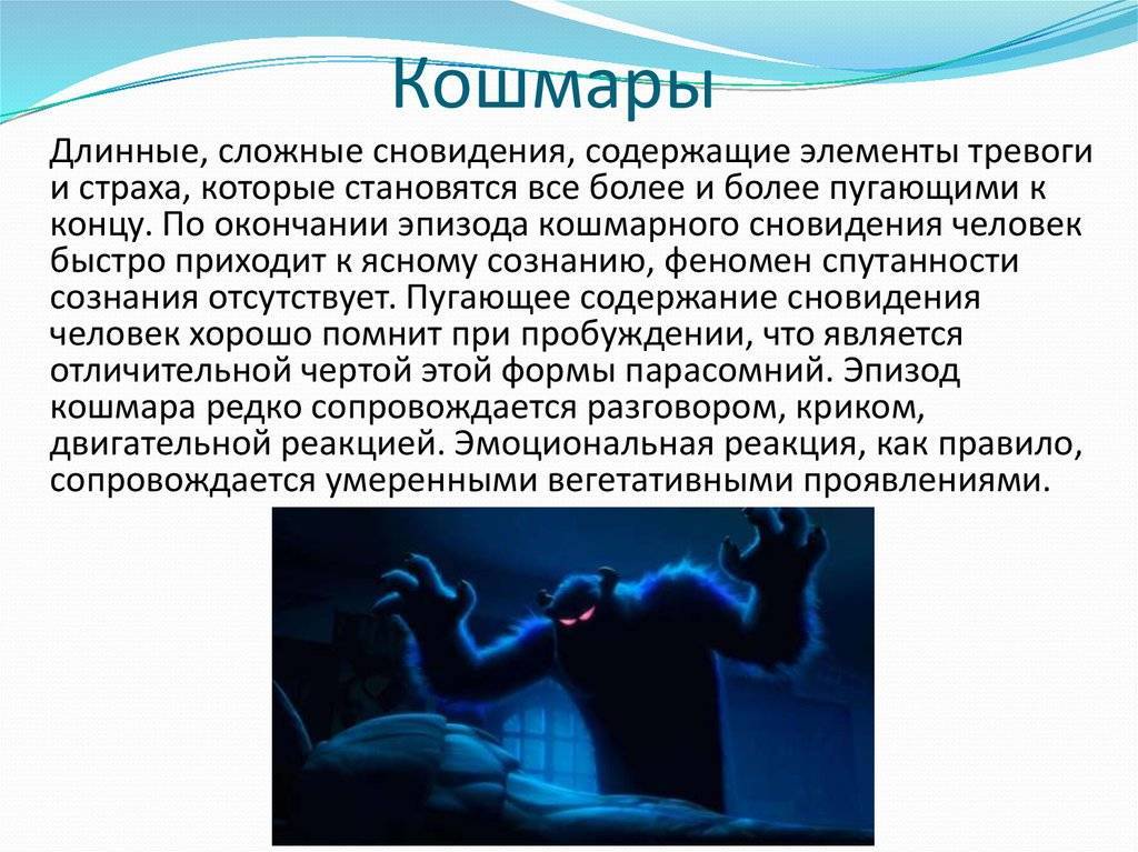 Сны, от которых просыпаешься, чувствуешь тревогу, страх, беспокойство, которые трудно «пережить» и от них вы ощущаете опасность для своей жизни, называются кошмарами.