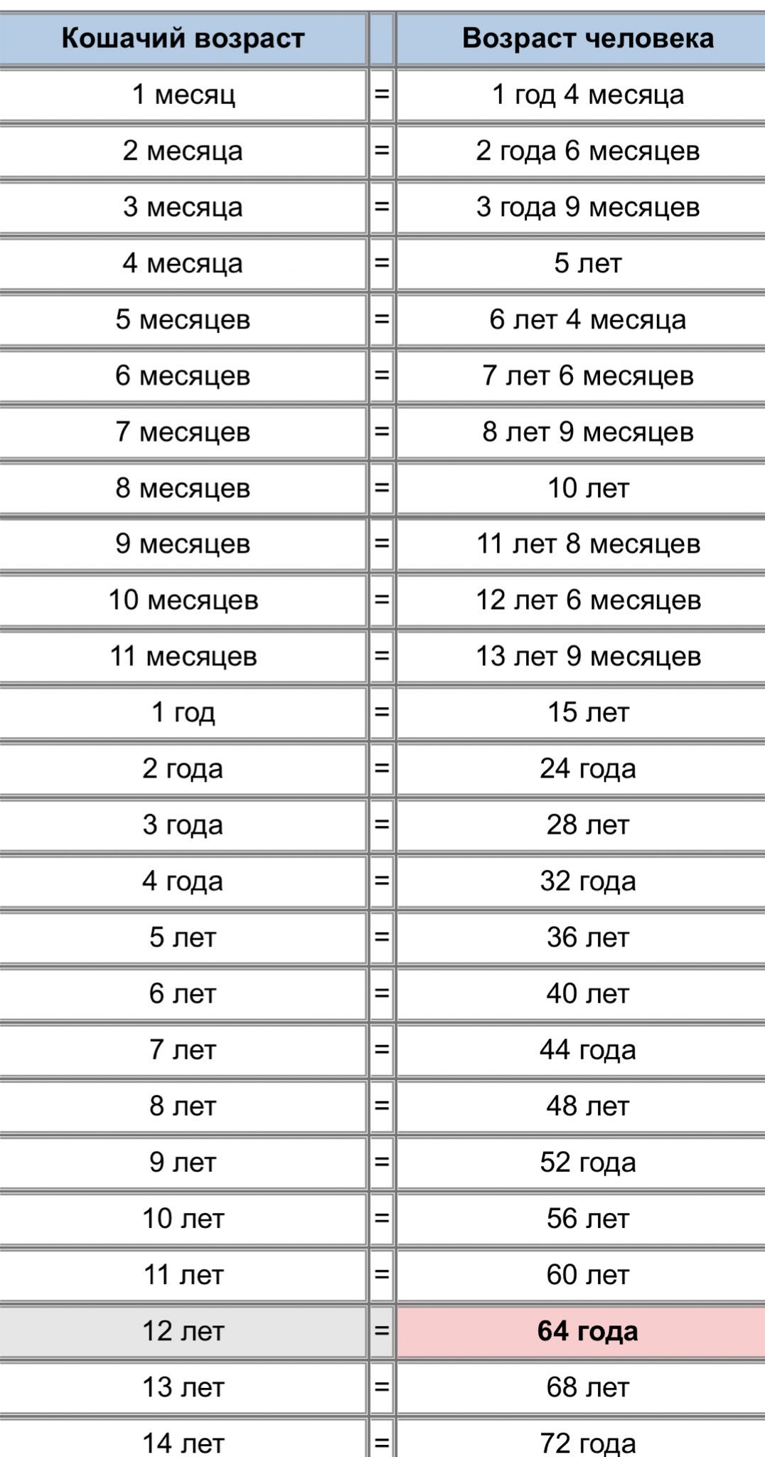 | Возраст собаки | 1 год | 2 года | 5 лет | 7 лет | 10 лет | 12 лет | 16 лет |
