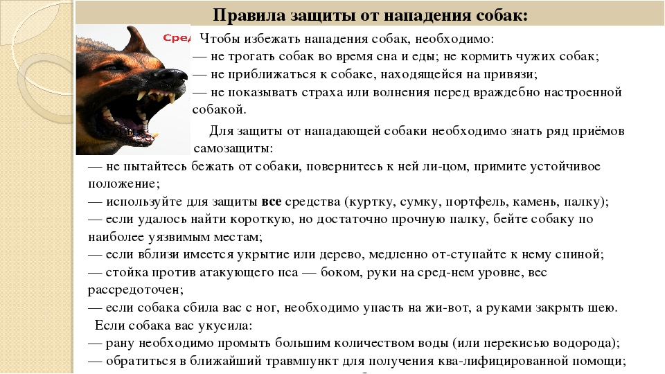 Сохраняйте спокойствие, замрите и не двигайтесь. Не поворачивайтесь к собаке боком или спиной и не смотрите ей в глаза. Накройте голову и шею курткой или закройте руками.