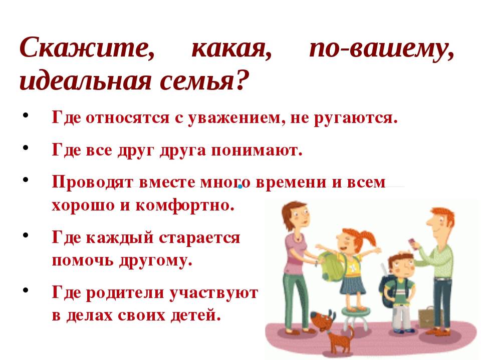 Такой, где всегда царит взаимопонимание. Здесь никто не скандалит, все всегда имеют время на беседы и готовы друг друга выслушать, а недоразумения и легкие конфликты сразу же проясняются. В идеальной семье никто не кричит, не бьет посуду, не хлопает дверьми, а стресс сводится к минимуму. Члены идеальной семьи стараются избегать всего, что может послужить источником несогласия и не хотят встречаться с конфликтом лицом к лицу.