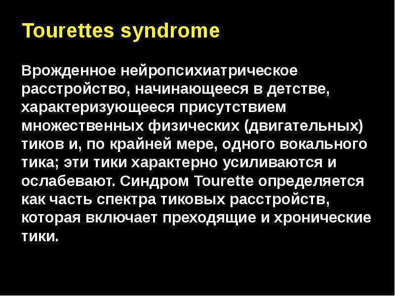 Синдром Туретта представляет собой комплексное расстройство, характеризующееся повторяющимися, внезапными и непроизвольными движениями или шумами, называемыми тиками. Тики обычно появляются в детстве, и их тяжесть меняется со временем.
