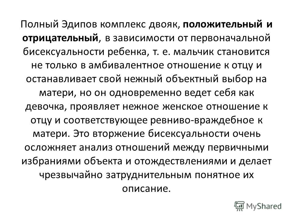 Фрейд использует греческую трагедию «Царь Эдип», чтобы проиллюстрировать универсальность амбивалентности ребенка по отношению к своим родителям, а также развитие гетеро- и гомосексуальных компонентов.