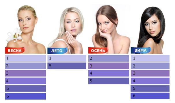 «Лето» — наиболее распространенный цветотип, для которого характерны русые волосы, светлая кожа и глаза. Среди оттенков лилового уместны фиолетовые, холодные и яркие тона с серым, сиреневым отливом, которые выгодно подчеркнут особенности внешности.