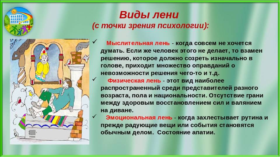 С точки зрения психологии, лень — это лишь симптом, а мотивы нежелания действовать лежат глубже. Лень даже подразделяют на несколько видов в зависимости от причины возникновения: недостатка мотивации, психофизиологических особенностей человека, банальной усталости.