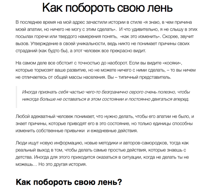 Прошу не путать лень с прокрастинацией! Это совершенно иное психологическое состояние – человек и рад бы был что-нибудь осуществить, но не может, даже самые стоящие дела откладывает на потом!
