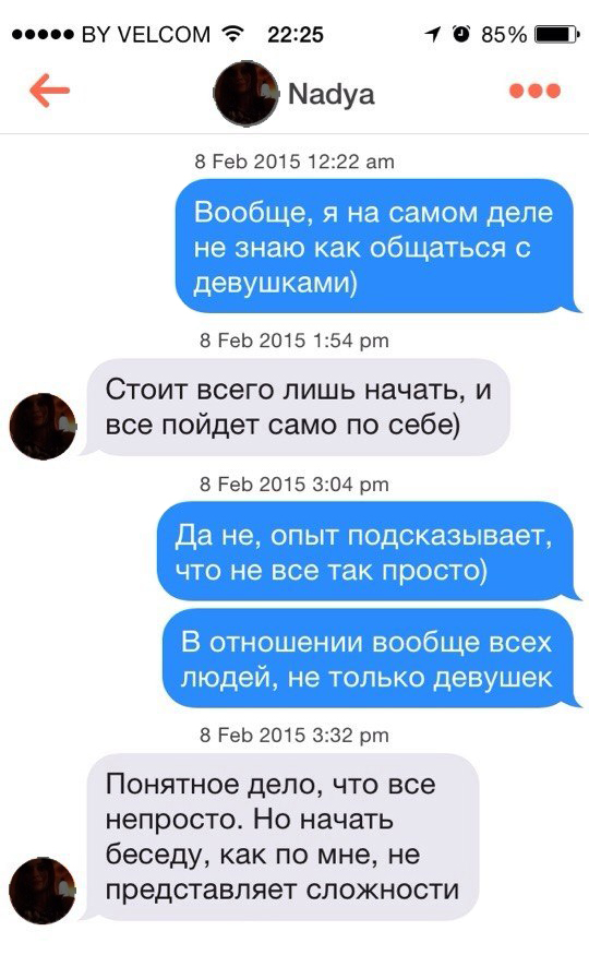 Для начала приведу пример самого распространённого диалога по переписке. Сразу скажу, что это один из самых скучных разговоров, который не продлится и нескольких минут, и то при условии, что девушка будет к тебе благосклонной и позитивно настроенной.
