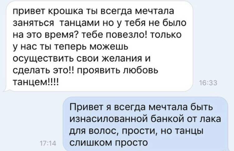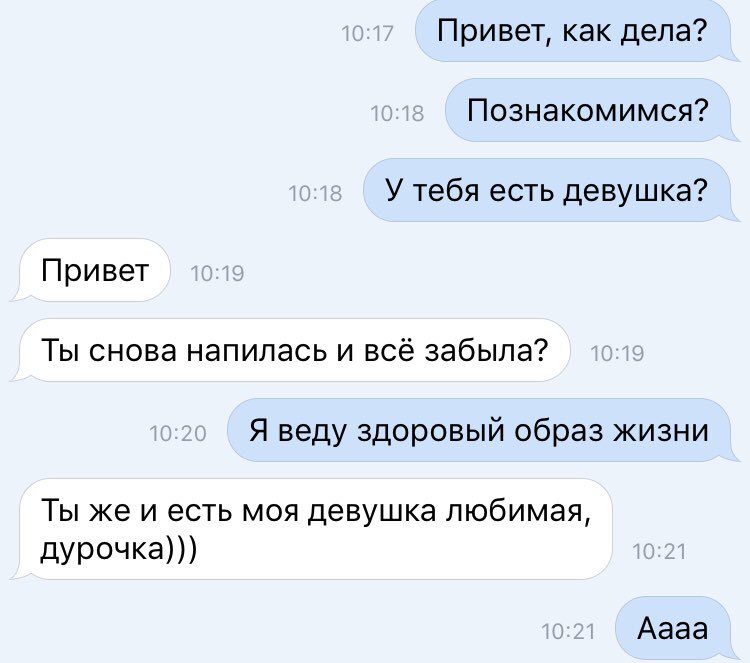 Вроде бы, это и так понятно, но многие первый сообщения со стороны мужчин всё ещё изобилуют различными «чё». И если девушка решила Вас проигнорировать или сразу отшила (пусть и в грубой форме), ни в коем случае нельзя её обзывать. Даже если Вы никогда больше не пересечётесь, сохраняйте лицо и не опускайтесь до подобного;