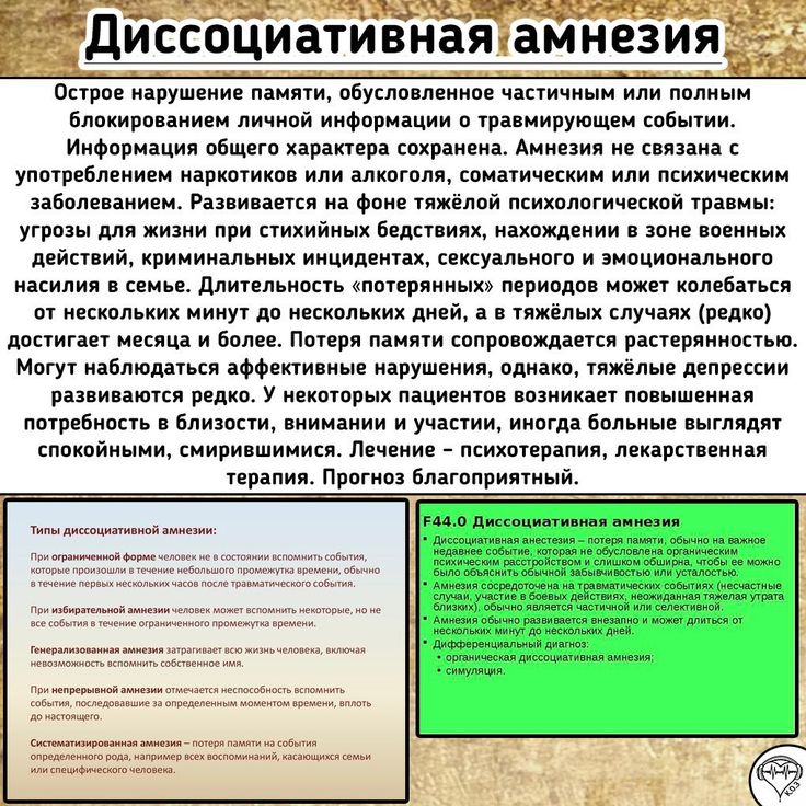 - Фуга или диссоциативная амнезия: В редких случаях человек может забыть и свое прошлое, и свою личность. Они могут проснуться и внезапно не понять, кто они. Триггером обычно является травматическое событие. Способность запоминать обычно возвращается в течение нескольких минут, часов или дней, но память о событии, вызвавшем триггер, может никогда не вернуться полностью.