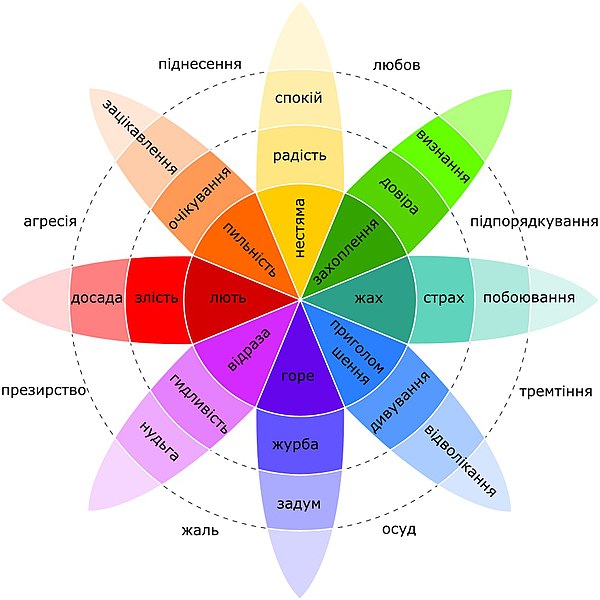 Колесо эмоций использует цвет для изображения отдельных эмоций и их сочетаний, использует их градиенты для выражения интенсивности и использует геометрическую форму для отражения полярности (или сходства) эмоций.