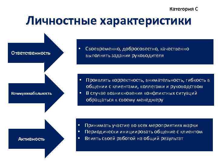 - Личностные качества сотрудников – наиболее значимый раздел, включающий: