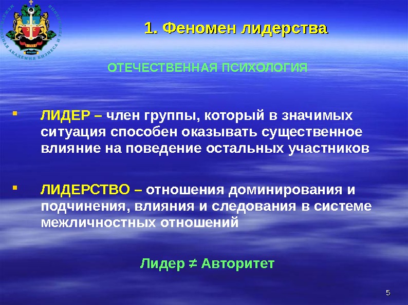 Лидерство – это важнейший компонент эффективного руководства. Лидерство встречается везде, где есть устойчивое объединение людей. Само слово «лидер» означает «вождь», «ведущий». Несмотря на кажущуюся простоту этого понятия, в современной науке при наличии общности позиций различных психологов, понятия «лидерство» и «лидер» характеризуется неоднозначно.