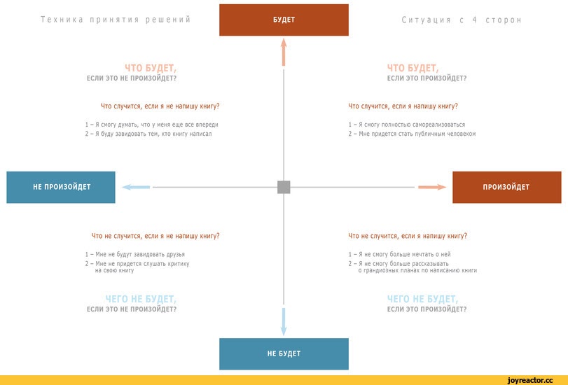 Чем этот способ отличается от классических двух столбиков с аргументами за и против? Традиционный метод, без сомнения, работает, но часто мы не можем ограничиться только плюсами и минусами, потому что нам требуется больше вариантов и проблема должна быть рассмотрена с разных углов. Кроме того, обычно мы задаем себе только один вопрос: «Что случится, если это произойдет?». Из-за такого упрощения, сами того не понимая, мы загоняем себя в ловушку и не пропускаем целый пласт других критериев