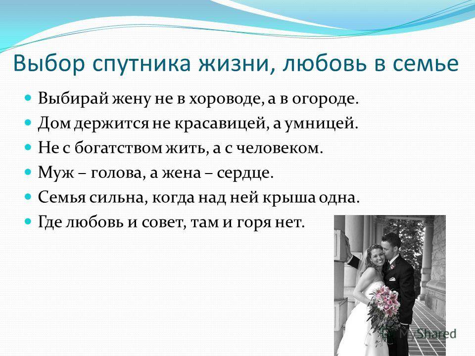 - Есть мнение, что любовь приходит и уходит, а жизнь продолжается. Многие люди считают, что наилучшим основанием для брака является положительность характера и уважение к будущему спутнику жизни.