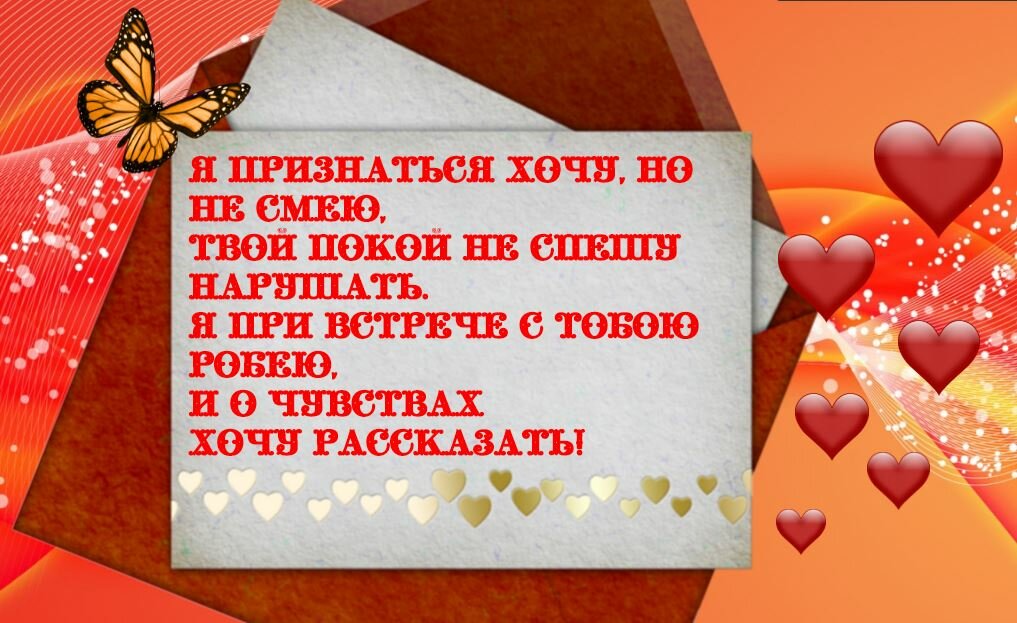Божественная, воздушная, прекрасная, неземная, восхитительная женщина! Она светится ярче, чем сто самых ярких небесных светил, ее глаза бездоннее, чем самая глубокая точка Тихого океана, в них можно смотреть бесконечно. Каждый раз, когда вы провожаете взглядом ее изящный силуэт, мысли ваши озаряются и становится на душе хорошо даже в самый пасмурный и дождливый день. Ничто на свете не радует вас так, как её улыбка, которая ослепительна и белоснежна! Она вам дороже всего на свете. Хотели ли бы вы, чтобы она принадлежала только вам? Сообщите ангелу своего сердца о чувствах в нежном и искреннем признании.
