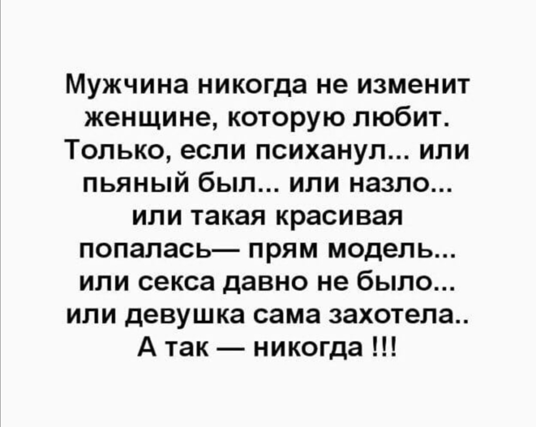 Мужчина боится перемен, поэтому изменяет, но не уходит. Да, он может любить другую женщину, но бросить семью ему просто страшно.Он думает: «А если чувства к любовнице остынут? А если сама любовница через какое-то время бросит его? К тому же снова придется налаживать быт, решать какие-то проблемы.