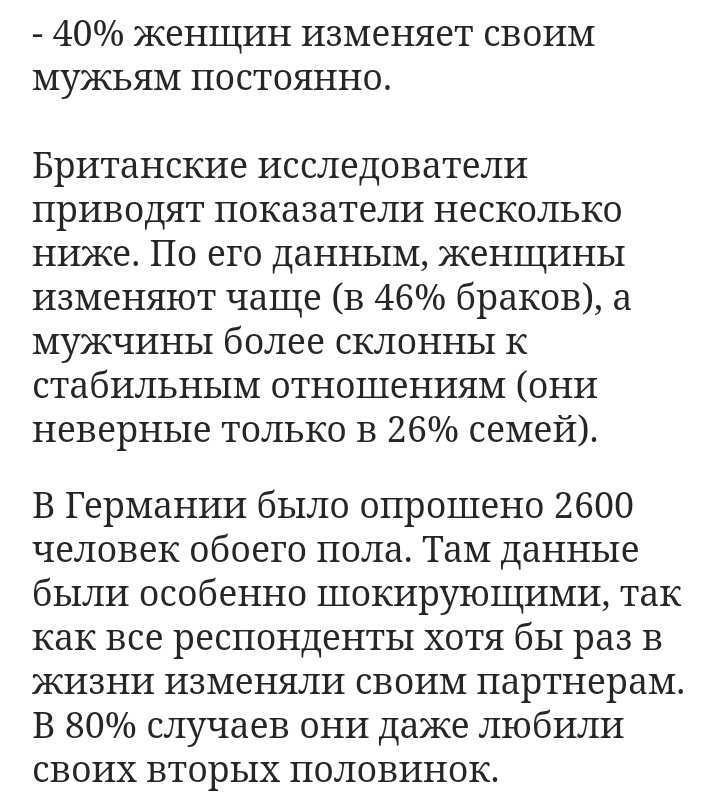 Одно исследование показало, что 2.2% состоящих в браке людей сообщили, что у них было более одного партнера в течение года. В целом, по данным исследователей, от 15 до 25% состоящих в браке американцев имеют романы, и мужчины более склонны к измене, чем женщины. И возникает вопрос, почему обманывающие мужья не хотят разводиться, но продолжают изменять.