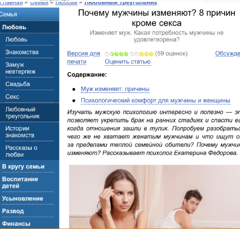 Поэтому изменять они могут едва ли не с чистой совестью – главное, чтобы об этом никто не узнал. А разного рода масс-медиа только подливают масла в огонь: якобы измена мужчины – в порядке вещей, и ничего с этим не поделаешь. Кстати, подобная пропаганда имеет влияние и на женщин. Кто-то из них даже может позволить мужу изменять – с тем условием, чтобы самой оставаться в неведении. Мужчины, конечно, этим пользуются.