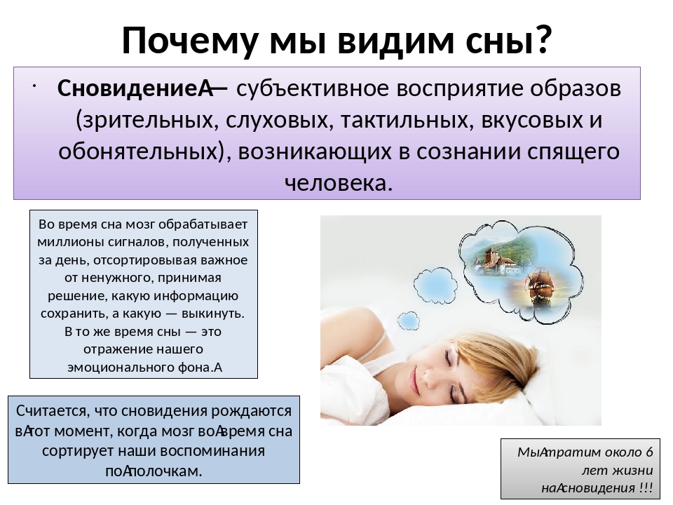 Во время сна мозг пытается систематизировать все воспоминания и знания, полученные за день, и сновидения происходят во время их перемещения из краткосрочной памяти в долгосрочную. Ведь в этот момент некоторые из воспоминаний могут активизироваться и это отражается в виде появления тех самых образов, что, как нам кажется, проходят перед нашими глазами.
