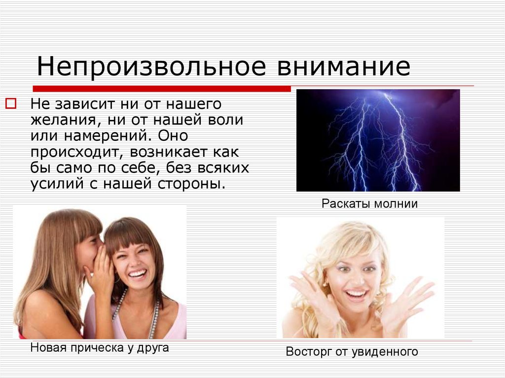 Непроизвольное внимание возникает без всяких стараний, оно не связано с какими-то определёнными действиями и усилиями, а возникает как реакция на всё, что нас окружает.