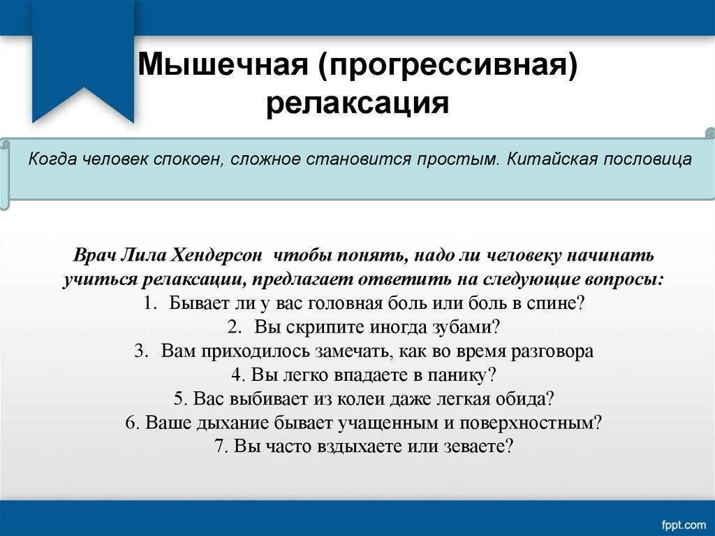 Нервно-мышечная (прогрессивная) релаксация по Джекобсону