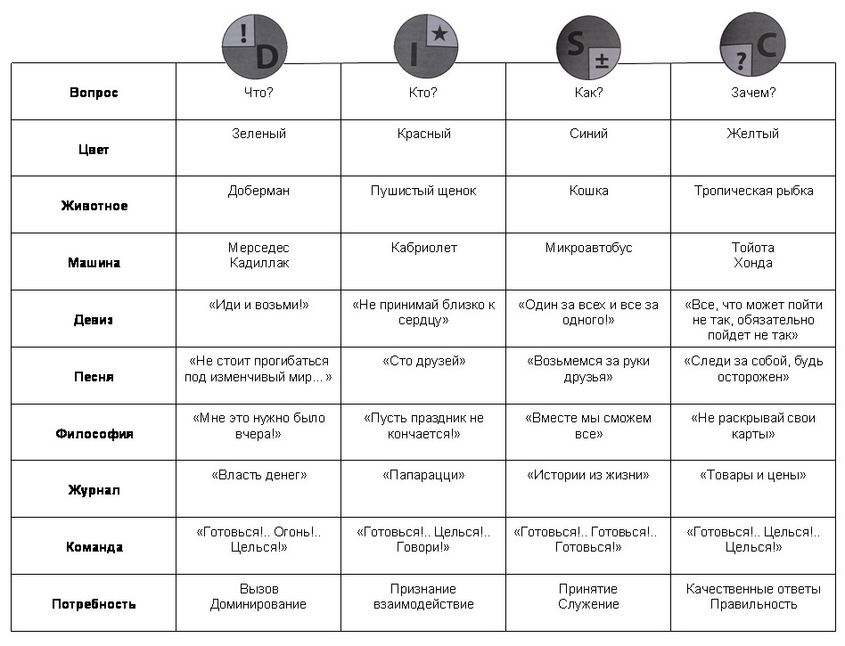 | Психология цвета Эриксон объясняет, что он решил использовать цвета вместо терминов DISC для простоты понимания, но он не объясняет, почему он выбрал цвета, которые он сделал, или как он назначил их. Одна область психологии специально изучает влияние цвета на наше тело и разум. Исследование весьма анекдотично, но появилось достаточно закономерностей, и психологи считают, что существуют некоторые универсальные истины, когда дело доходит до психологии цвета. Красный: Одно исследование обнаружило связь между восприятием доминирования, красным цветом и тестостероном. Было установлено, что участники (все мужчины), которые решили носить красное во время соревновательного мероприятия, имели более высокий уровень тестостерона, чем участники, которые выбрали синее. Желтый: Психология цвета говорит, что люди ассоциируют желтый цвет с оптимизмом, энергией и теплом — весьма вероятно, из-за нашего отношения к солнцу. Было также показано, что он вызывает чувство разочарования и подавленности, когда его переусердствуют. Зеленый: Зеленый цвет часто вызывает в памяти образы природы, которые оказывают успокаивающее действие. Зеленый издавна был символом плодородия и новой жизни из-за его связи с весной. В зеленой среде есть и вода, и солнечный свет, поэтому он воспринимается как безопасный и питательный цвет, в котором будут процветать живые существа. Синий: Синий цвет у большинства людей ассоциируется с водой, что объясняет, почему он приносит чувство безмятежности и надежности. В отличие от растений, вода не меняет цвет в зависимости от времени года; это всегда тот цвет, которого вы ожидаете. |