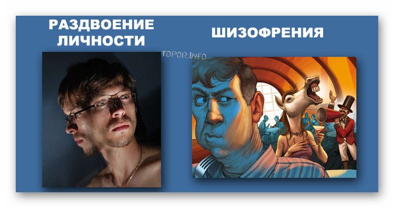 переживание диссоциативного расстройства личности (ДРИ). У человека с шизофренией нет двух разных личностей, он скорее теряет связь с реальностью. «Раздвоение сознания» при шизофрении на самом деле является отрывом от реальности, а не раздвоением личности. В то время как у человека с ДРИ есть две или более разные личности, которые управляют его мыслями, действиями и поведением. Эти личности могут иметь свою личную историю, черты, симпатии и антипатии; и может быть связано с детской травмой. Несмотря на то, что люди с шизофренией иногда могут вести себя непредсказуемо, множественное расстройство личности совершенно не связано с этим.