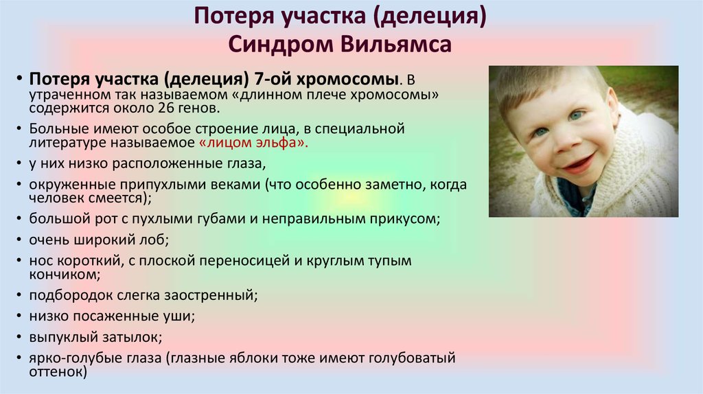 Синдром Вильямса (WS или WMS) или синдром Вильямса-Бёрена (WBS) возникает из-за удаления примерно 26 генов из хромосомы 7.