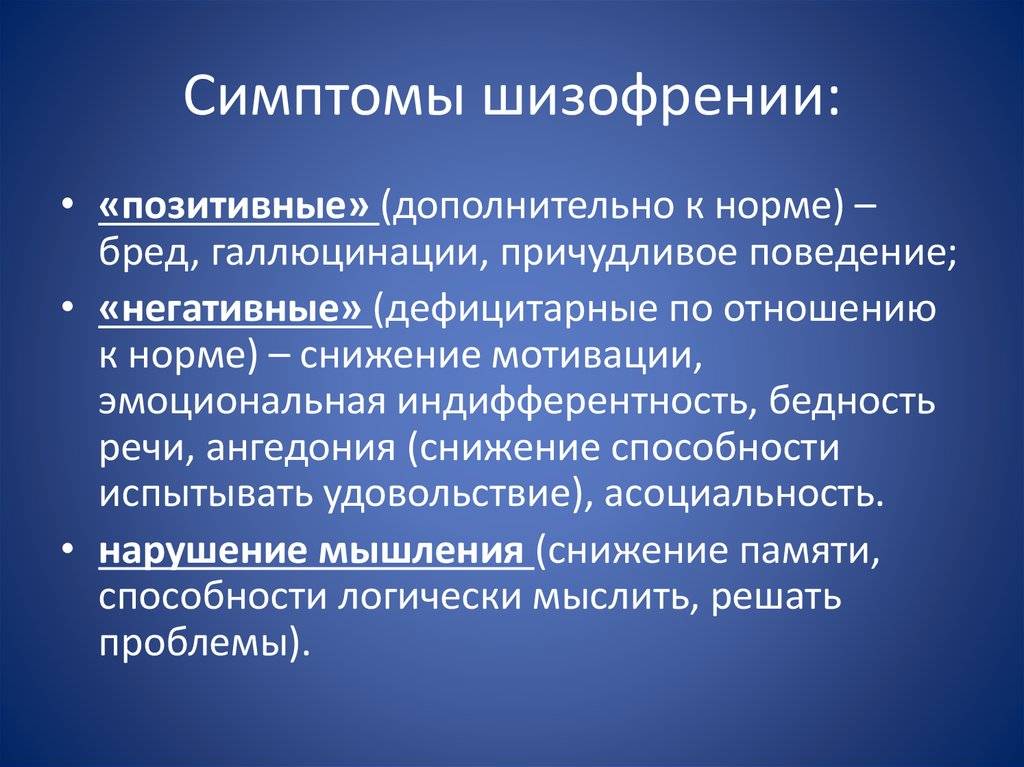 К позитивным относятся галлюцинации и мании, к негативным — отсутствие мотивации, замыкание в себе, отсутствие интереса к окружающей жизни. Негативные симптомы, как правило, более долгосрочны и труднее поддаются лечению.
