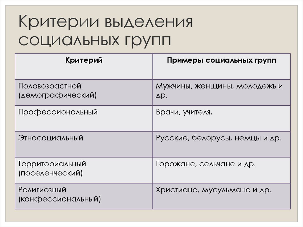 - половозрастные группы (молодежь, женщины, пожилые и т.д.).