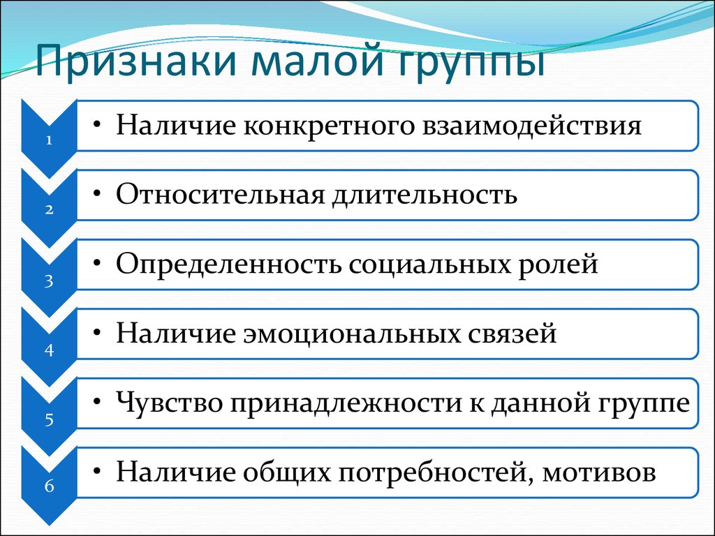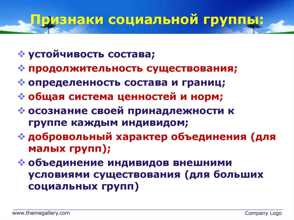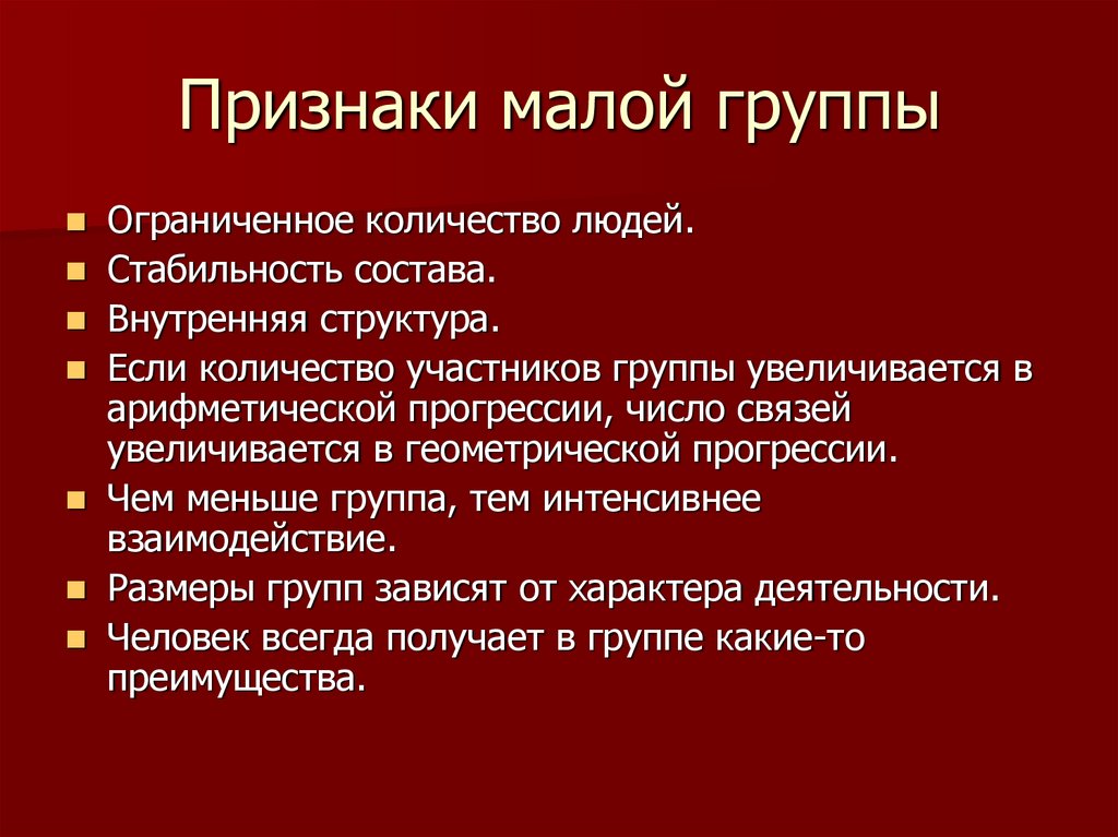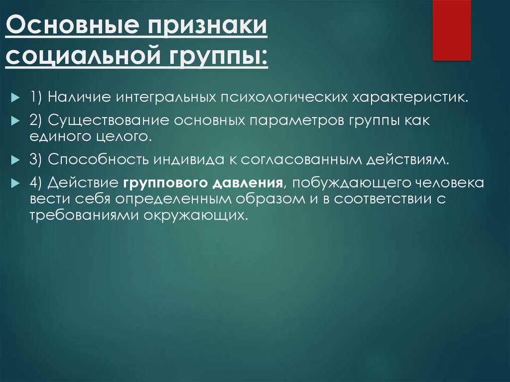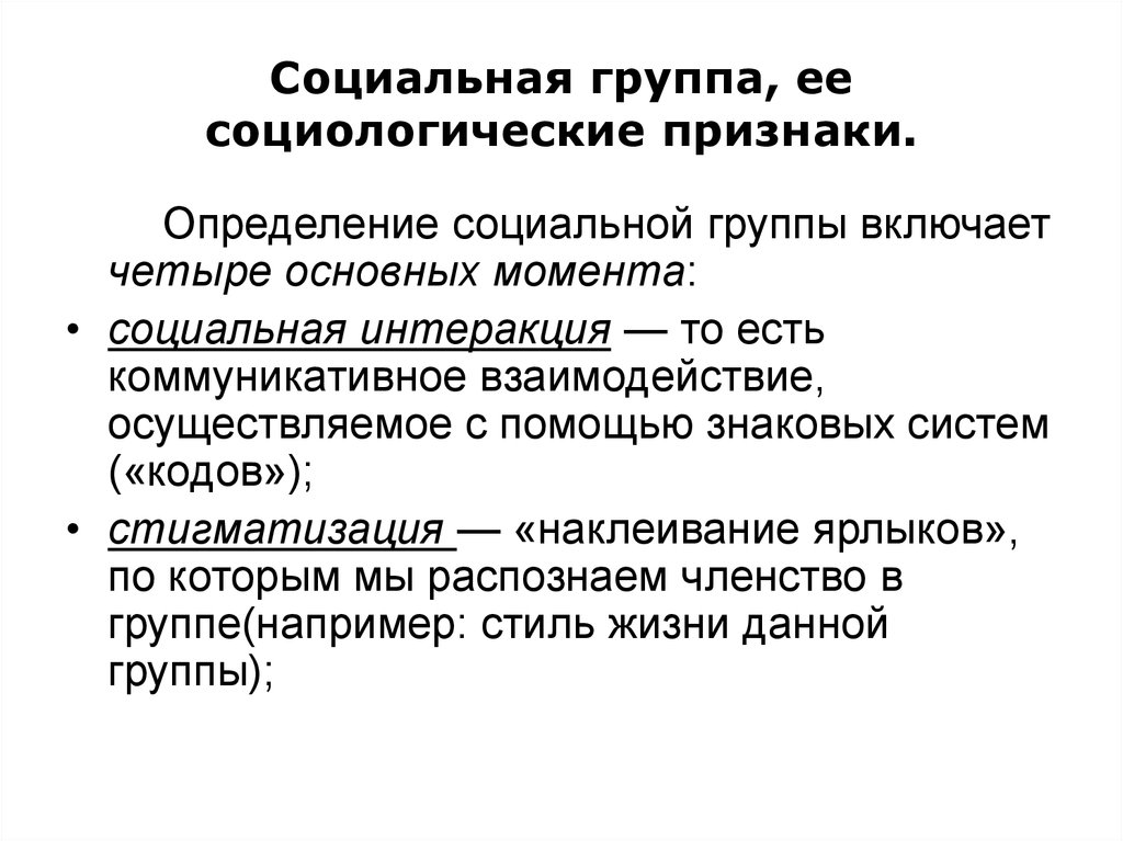 Под социальной группой понимается любая совокупность индивидов, находящихся во взаимодействии, объединенных общими интересами и оказывающих друг другу помощь. Внешние отличительные признаки социальной группы: 1) развитие; 2) определенный набор социальных норм, регулирующих взаимодействие; 3) своя ролевая структура.