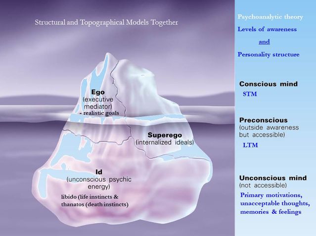 Исходя из этих задач и предпосылок исследования, Фрейд и пришел к заключению о том, что человеческая психика представляет собой некий сложный конгломерат, состоящий из различных уровней и компонентов, отражающих как сознательные, так и бессознательные процессы.