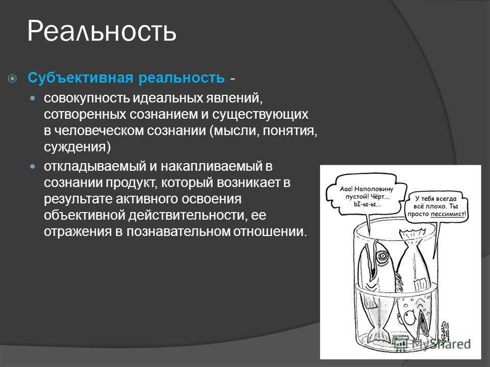 Субъективная реальность зависит от отдельного человека и от того, как именно он смотрит на окружающий мир и события, что происходят в нём. Мы привыкли видеть мир субъективно, но в то же время были созданы определённые философские концепции, с помощью которых можно объяснить данный феномен. Основным вопросом, который имеет отношение к познанию реальности, выступает то, что же на самом деле представляет собой реальность, и как она выглядит.