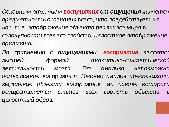 ВОСПРИЯТИЕ — это отражение сознанием человека предметов и явлений действительности в момент их воздействия на органы чувств.