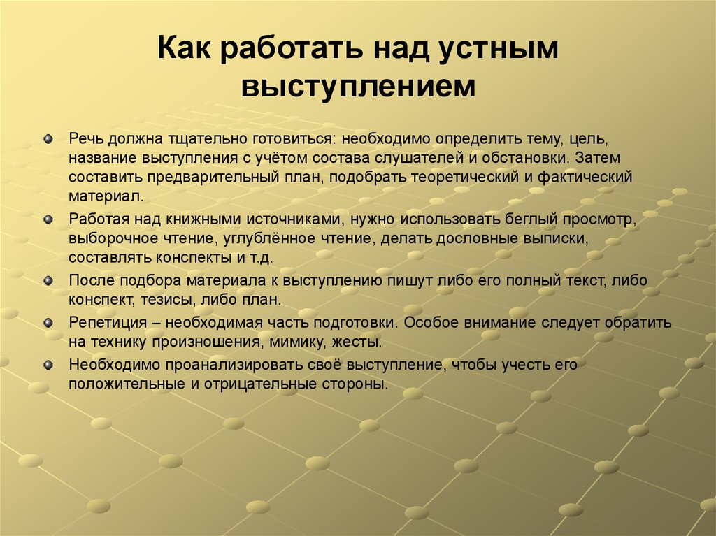 Зрительный контакт, мимика, озвучивание вопросов аудиторией позволяют оратору понять настрой, желание слушать и уровень проявления интереса посетителей. Получая обратную связь, он в любое время может откорректировать свое выступление. При установлении взаимодействия с аудиторией монолог оратора превращается в диалог с публикой. - Устная речь. Отличительной чертой устного публичного выступления является общение между слушателями и выступающим. Его необходимо ориентировать на целевую аудиторию, важна легкость в понимании доносимой информации. Словесное выступление имеет множество преимуществ над письменным, так как публикой усваивается 90 % устного материала.