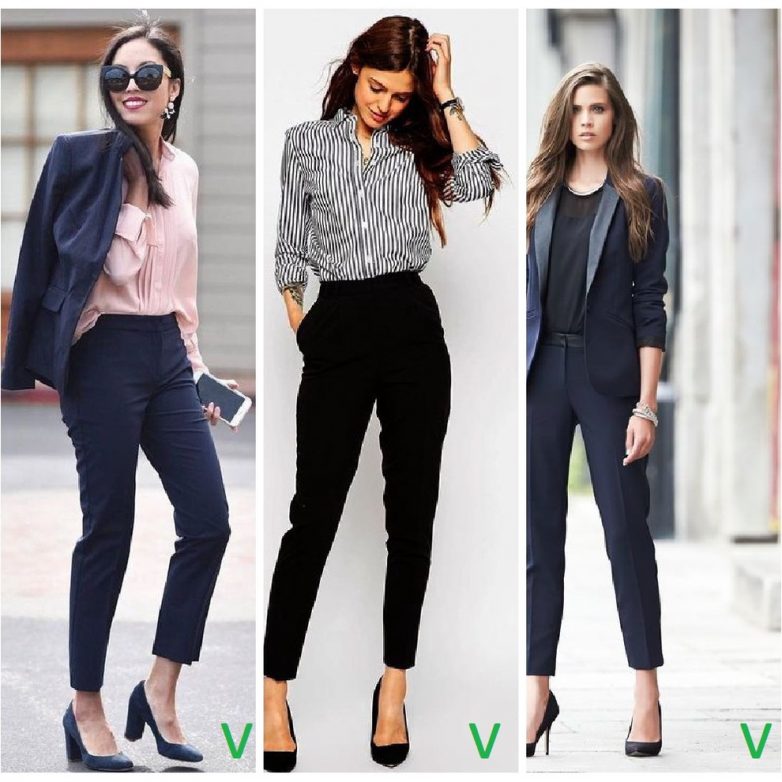 Брюки. Удачный классический вариант одежды для офиса. Поэкспериментируйте с цветовой гаммой (белые, коричневые, бежевые брюки) и с фасоном (клеш, укороченные, прямые, широкие и другие) или с интересным принтом.