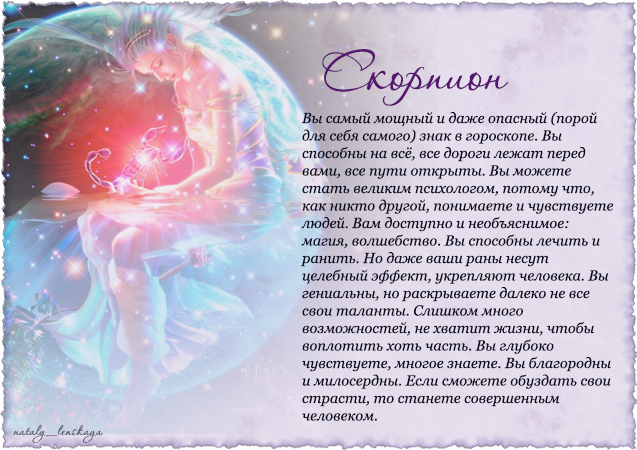 Несмотря на долгое знакомство с женщиной-Скорпионом, она все еще может быть загадкой. Но все ее близкие обязательно оценят ее удивительную индивидуальность и жизнерадостность. И вы, как ее возлюбленный, будете самым счастливым человеком, у которого будет красивый, преданный и ободряющий партнер, с которым вы почувствуете себя самым желанным человеком на Земле.
