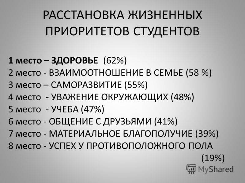Главные жизненно-важные приоритеты могут кардинально меняться с возрастом. Так, например, для молодого человека здоровье почти наверняка окажется в конце списка, а учеба – в начале.
