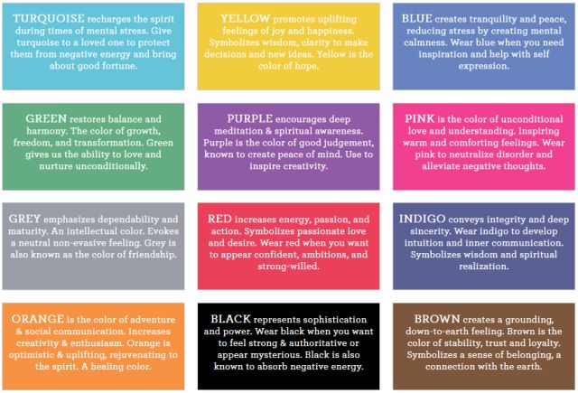 Голубой цвет — успокаивает, снижает мускульное напряжение и кровяное давление, успокаивает пульс и замедляет ритм дыхания;