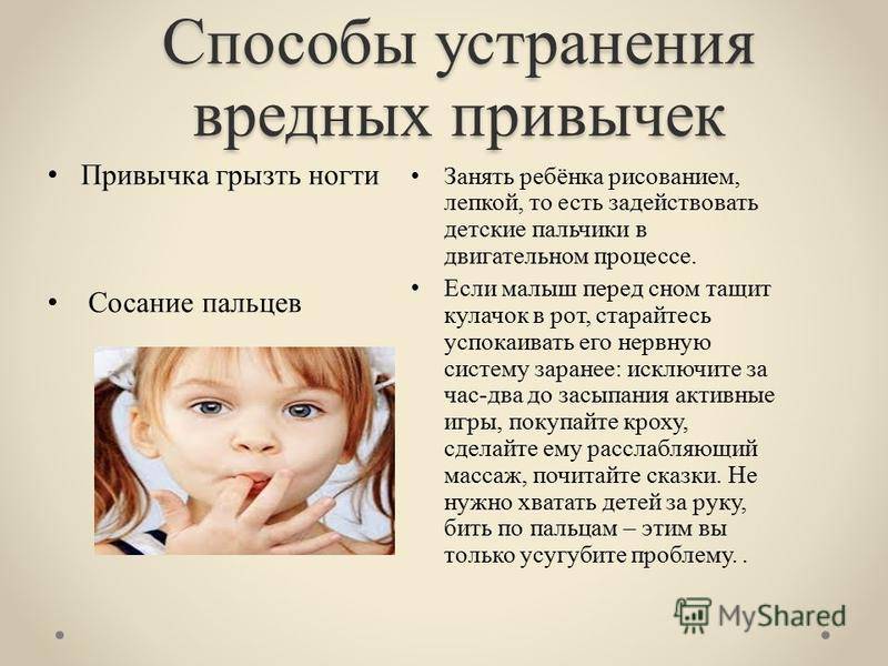 Наказание — не оптимальный способ избавления от привычек ребенка. Стоит в спокойной обстановке и в дружелюбной форме сказать ребенку, что эта привычка вам не нравится, и объяснить почему. Например, аргументировать свою позицию можно тем, что это некрасиво или небезопасно: таким образом в организм попадают микробы и вызывают болезнь.
